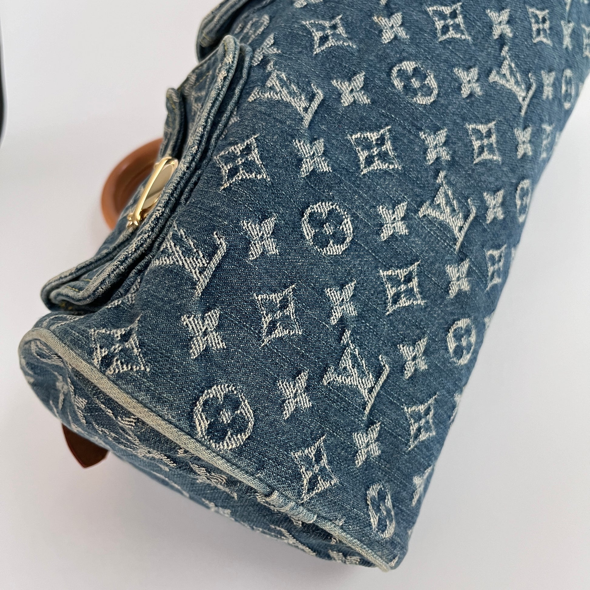 Condition: Good vintage condition in general. Water marks/ stains on vachetta leather part and on denim as shown in photos. Slight sign of use on interior. No odour.